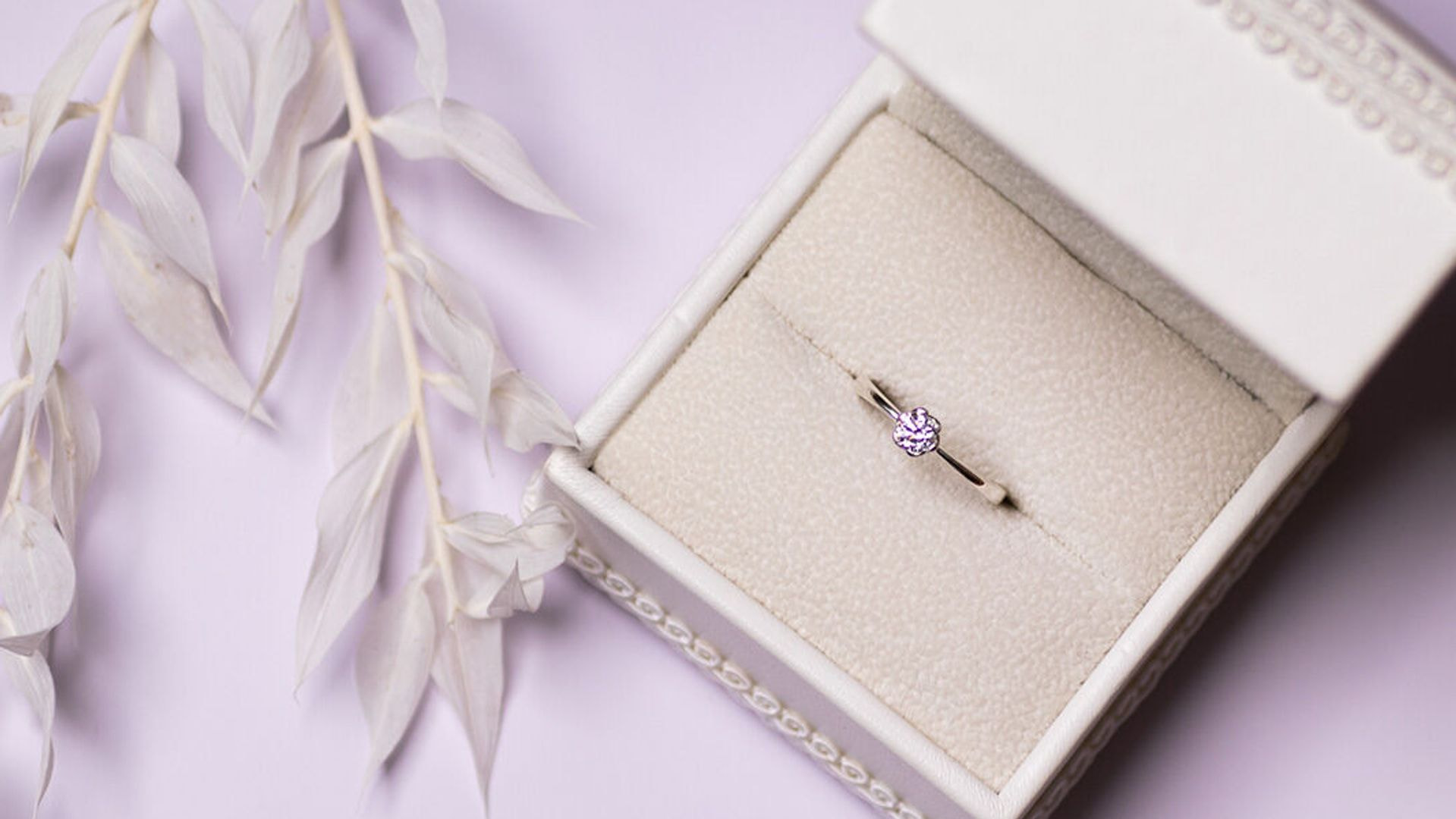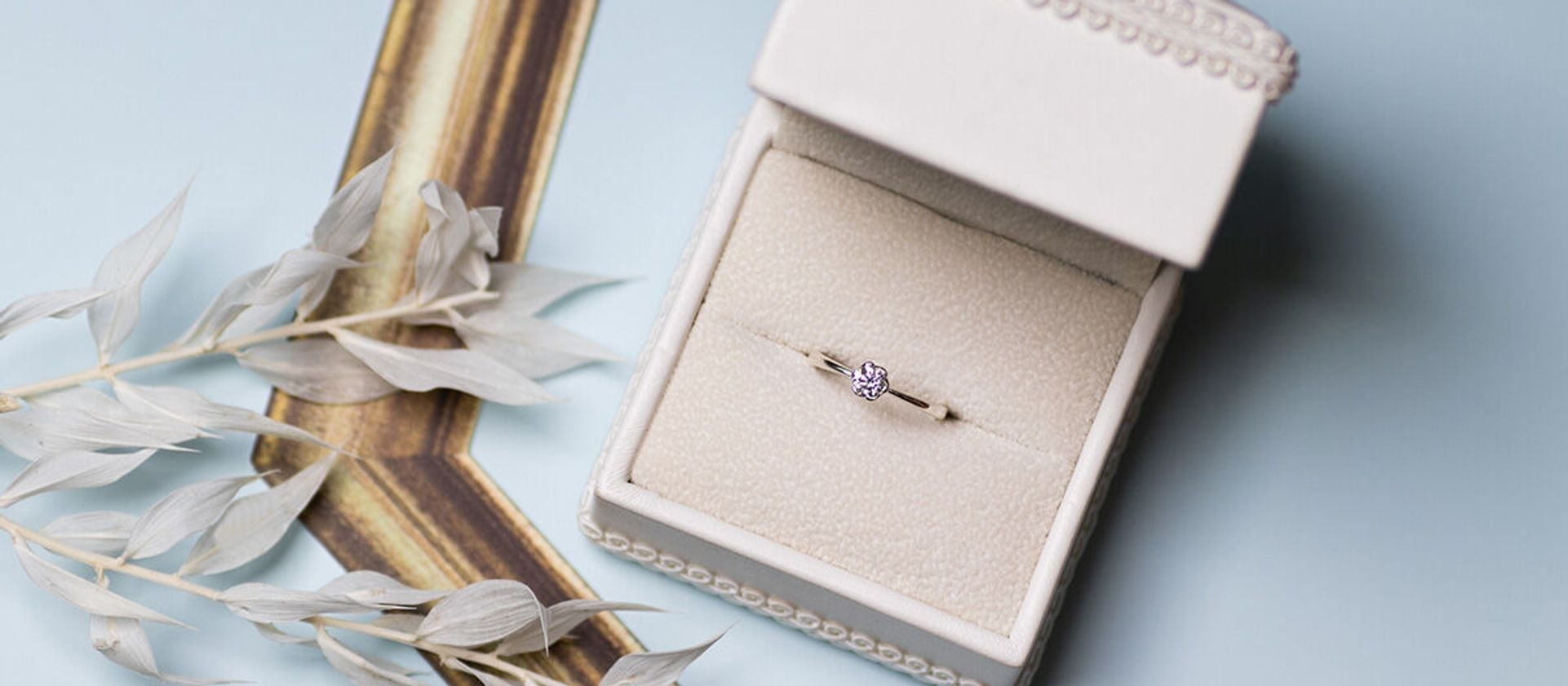 「婚約指輪」は、結婚の約束を交わした記念として男性から女性に贈る指輪のことで、エンゲージリングとも呼ばれます。ダイヤモンドのついた指輪を贈る方が定番となっていますが、彼女の誕生石でお作りされる方もいらっしゃいます。